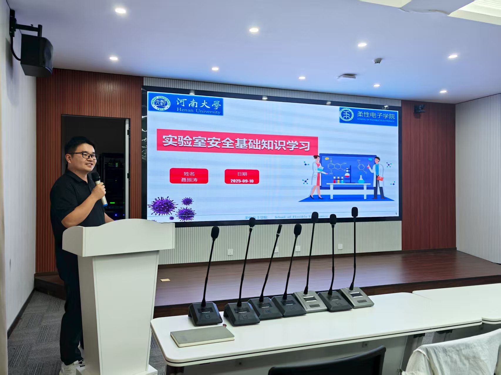 活动最后,聂振涛老师结合校园安全事故和火灾案例警示片,从实验室常见危险源,不安全行为,实验室操作规范,以及火灾发生时的应急预案,普及实验室安全知识与防护技能,划定了实验室“安全红线”,为同学们筑牢了实验室安全的思想防线。