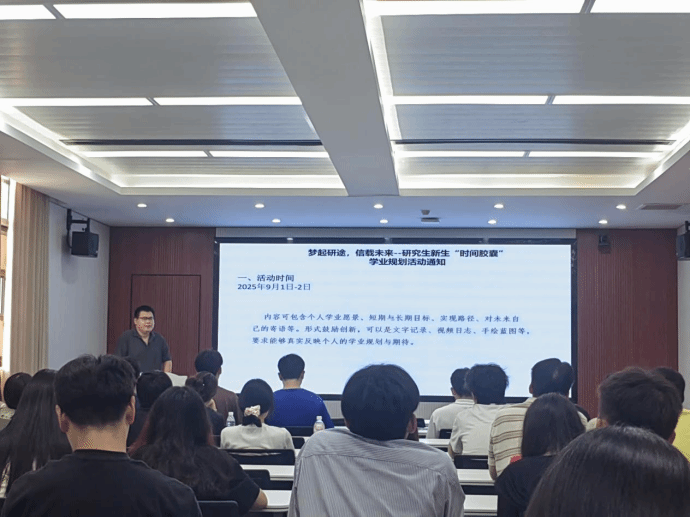 在九章学堂北组团C座二楼报告厅为2025级研究生新生举行"梦起研途,信载未来"时间胶囊活动。三十余名新生将记录着梦想与期望的信件投入特制的时间信封中,相约三年后毕业时共同开启,见证成长。