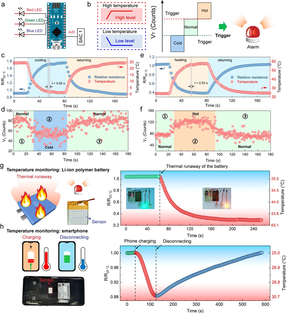 基于NiO/CNTF柔性温度传感器,研究者还开发了具有高低温报警功能的温度监测预警系统。在温度监测预警系统中,可以通过预先设定的高温和低温阈值,对监测的正常、过冷和过热温度进行警报指示。以锂离子电池为例,NiO/CNTF柔性温度传感器可以贴附在电池表面实时监测电池温度。当电池发生热失控时,温度监测系统可以及时检验到电池过热现象并报警。此外,传感器还可以贴附在智能手机表面,对手机充电时的温度变化进行同步监测,防止充放电过程温度异常引起的电子设备损坏和火灾等风险。