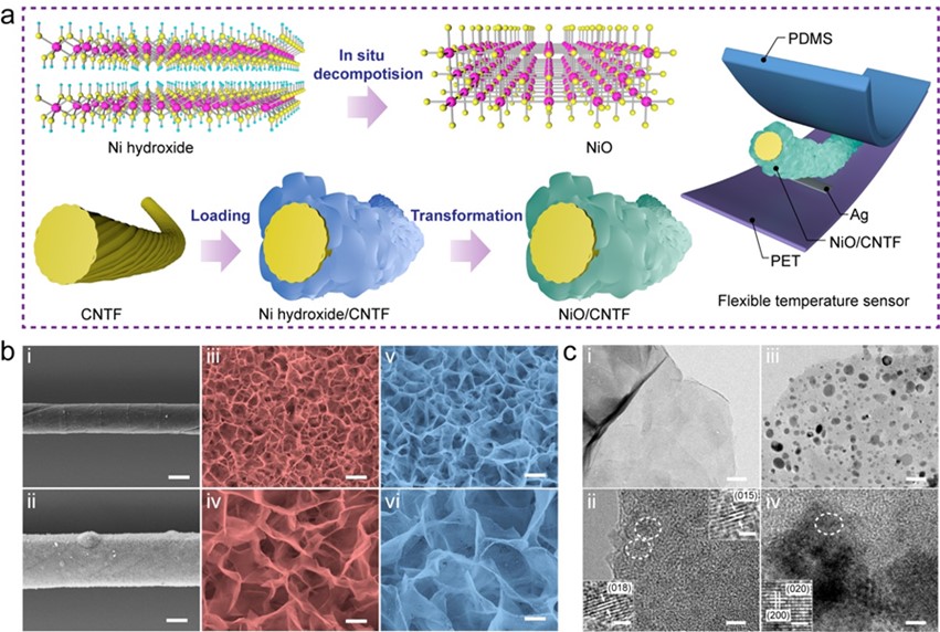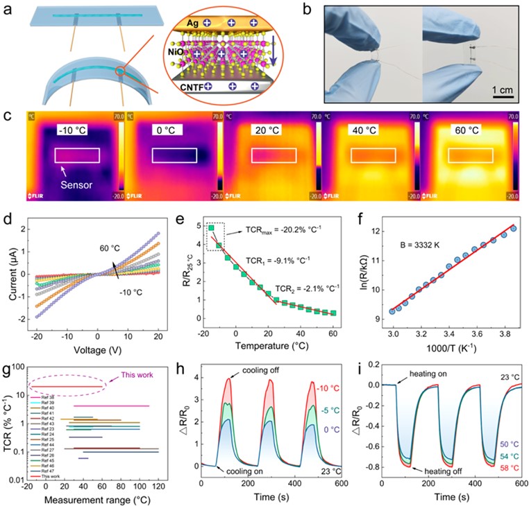 柔性传感器能够感知人体和环境的物理、化学和生物信息,在学术界和工业界引起了广泛的关注。其中,柔性温度传感器尤为重要,因为它们能够复制来自多种来源的热感,包括人体、环境和电子设备,这对于活动监测、环境感知和事故预警等应用具有极大的潜力,并可有效用于电子皮肤,人机交互,以及灾害预防系统。然而,由于构建具有高灵敏度的本征柔性监测器件的过程较为复杂,柔性温度传感器的工作范围和灵敏度仍有待进一步提升。作为过渡金属氧化物的一员,NiO因其高的电阻温度系数(TCR)和卓越的温度检测性能而被认为是理想的热敏半导体。因此,设计制备高灵敏NiO基柔性材料和器件对于开发具有高变形能力和传感性能的柔性温度传感器至关重要。