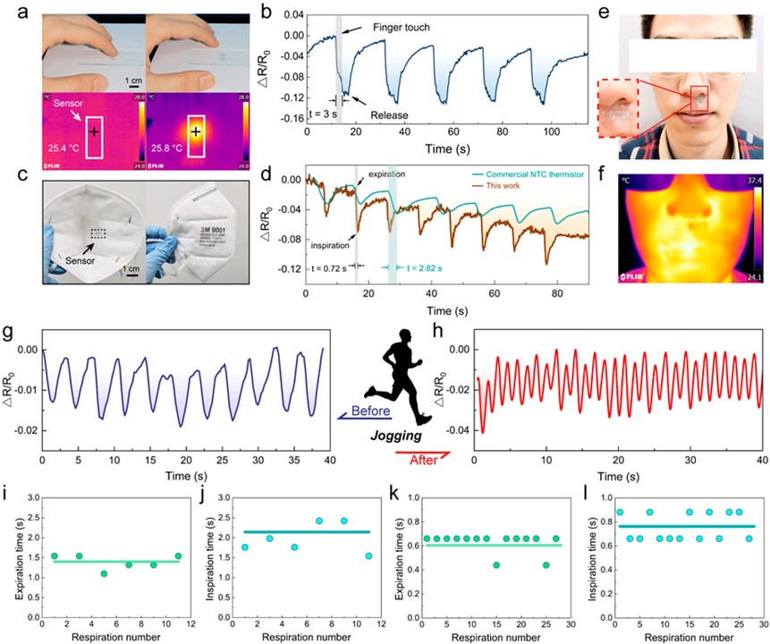NiO/CNTF柔性温度传感器表现出优异的灵敏度、灵活性和可调尺寸,在具有温度传感功能的电子皮肤或人机交互设备中具有巨大的应用潜力。NiO/CNTF柔性温度传感器能够应用于测量接触式人体热信号,如手指触摸产生的温度变化;还可以应用于呼吸等人体热信号的非接触检测,满足不同生理状态呼吸行为监测等多种应用场景需求,并验证了其比商用NTC热敏电阻具有更优异的信号强度和响应速度。
